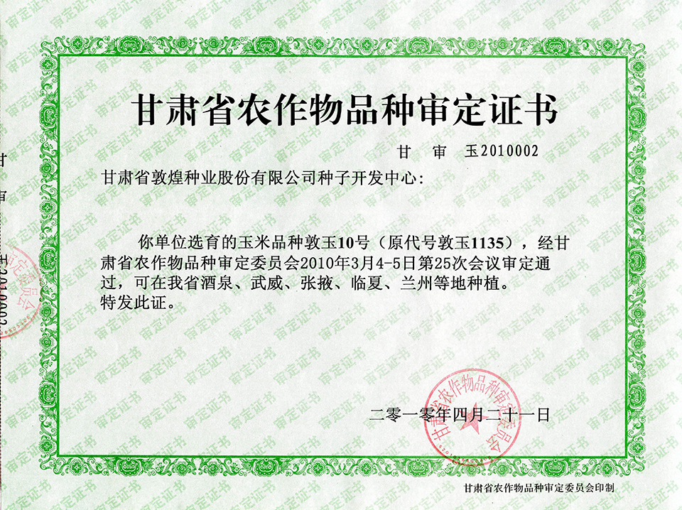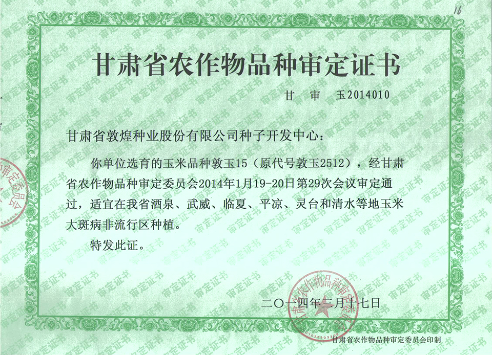 敦玉328品種審定證書(甘肅)